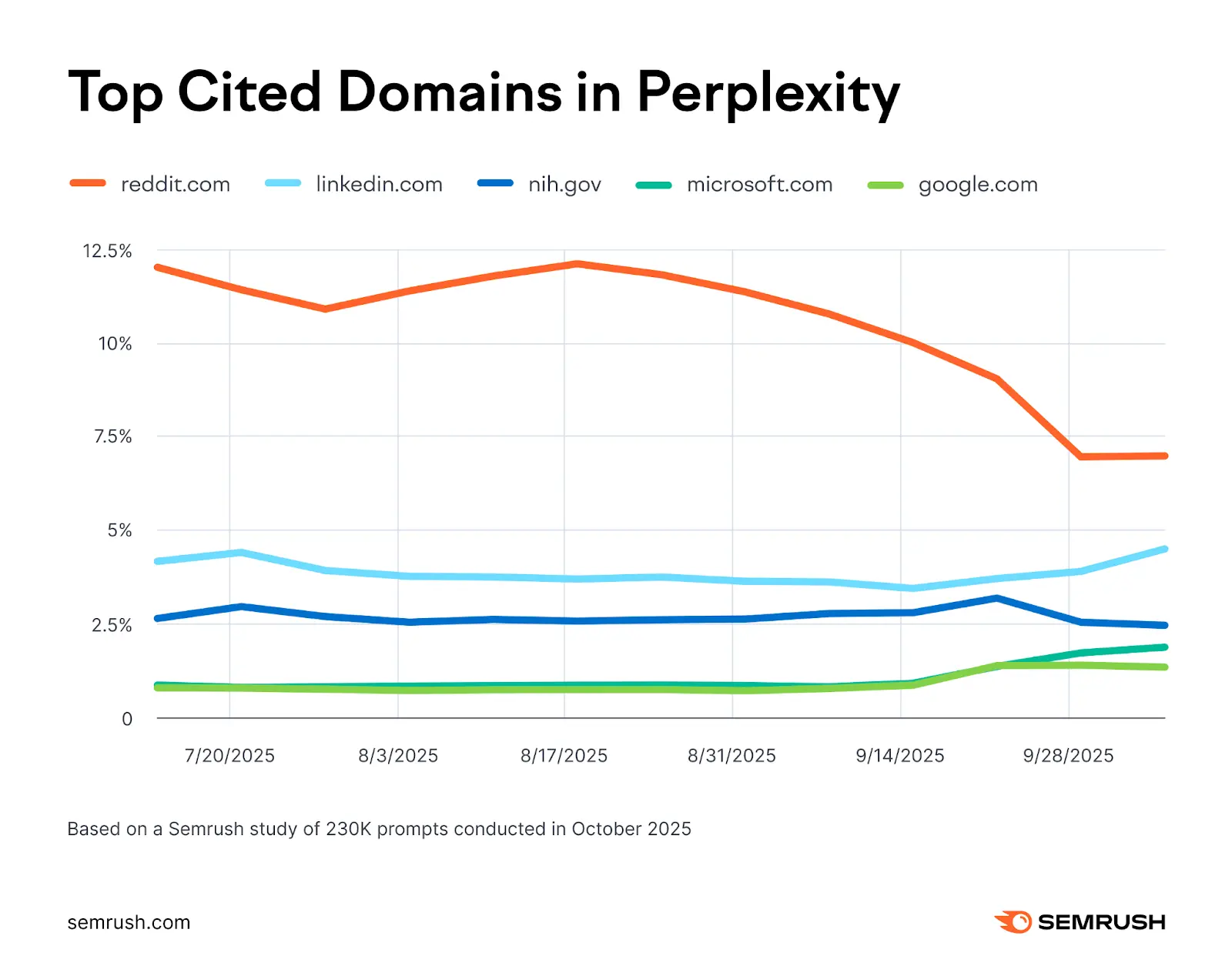 Une étude de Semrush indique d’ailleurs que Reddit est la principale source de Perplexity, tandis que ChatGPT Search s’appuie surtout sur Wikipédia, et que le mode IA de Google utilise principalement LinkedIn.