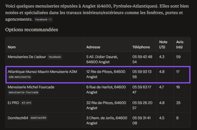 Pour être référencé, insérez des informations géolocalisées dans vos pages. Par exemple, notre client A3M Menuiserie est régulièrement cité par Perplexity pour ses agences dans différentes villes.
