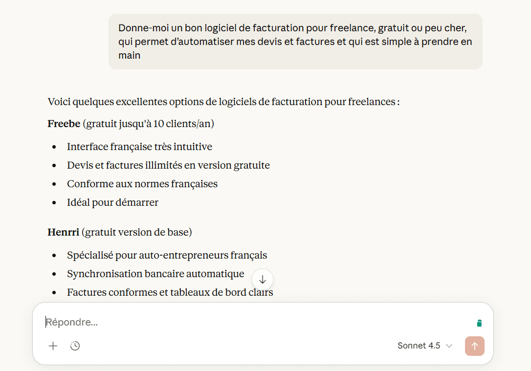 “Donne-moi un bon logiciel de facturation pour freelance, gratuit ou peu cher, qui permet d’automatiser mes devis et factures et qui est simple à prendre en main.”