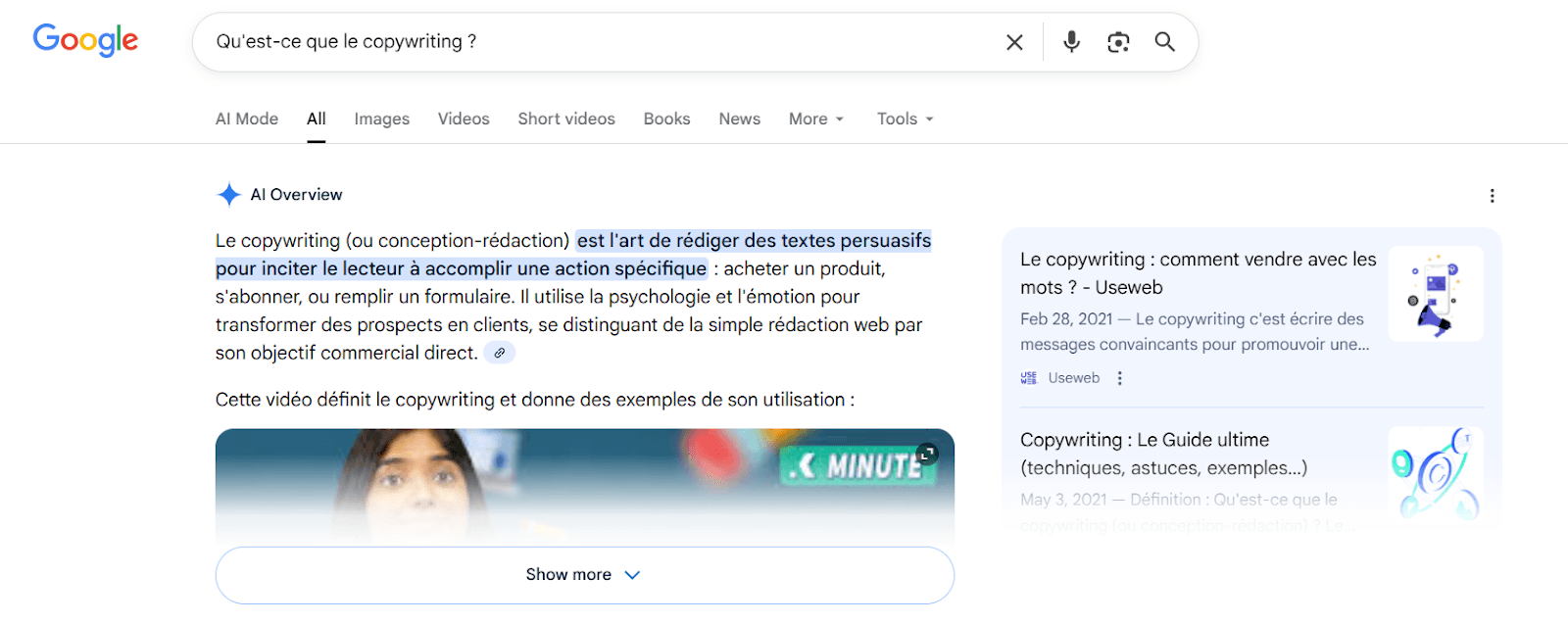 Avec AI Overview, Google intègre une intelligence artificielle directement dans la page de résultats. À titre d’exemple, si je tape une requête comme : Qu’est-ce que le copywriting ? AI Overview génère automatiquement une réponse qui s’affiche tout en haut de la page de recherche.